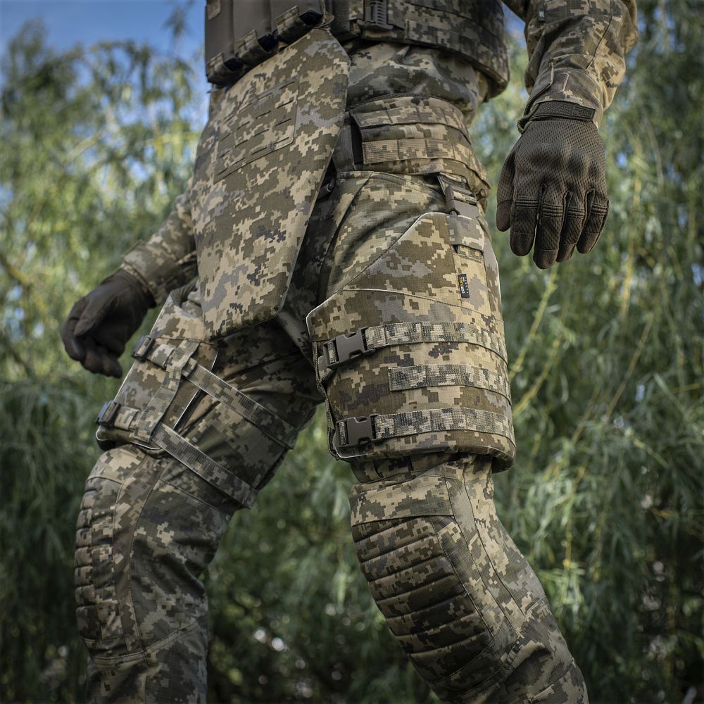 Стегновий захист виготовлений з Cordura 500D - міцного матеріалу, стійкого до механічних пошкоджень та високих навантажень. Внутрішня частина модуля виконана з 3D сітки, яка забезпечує амортизацію, гарну терморегуляцію та комфорт при використанні. Також, стегнові накладки укомплектовані балістичними пакетами 2-го класу, які захищають від рикошетів та уламків. Бронепакети зроблені з надвисокомолекулярного поліетилену та відповідають STANAG 2920 з показником протиуламкової стійкості V-50 близько 758,6 м/с.