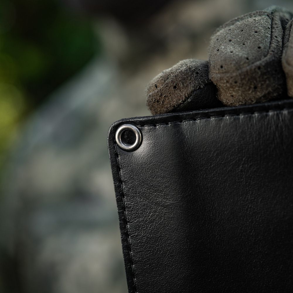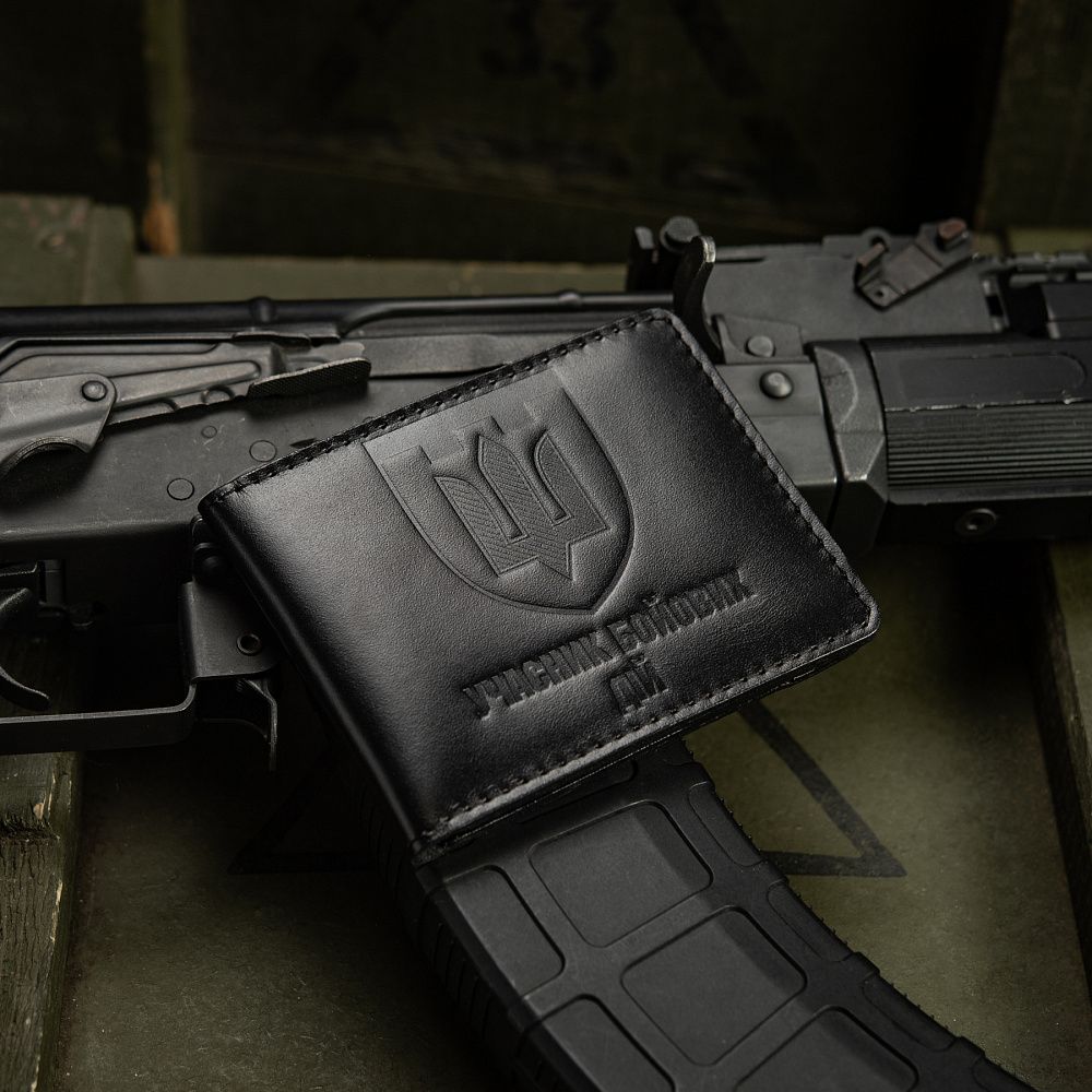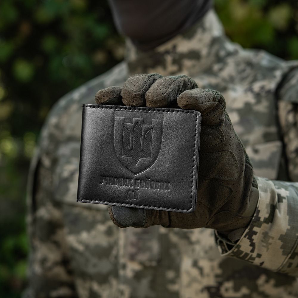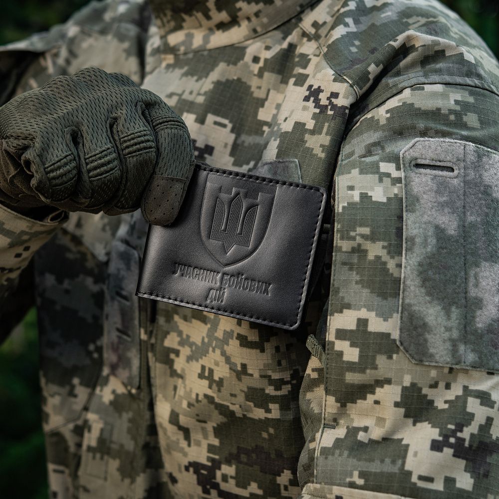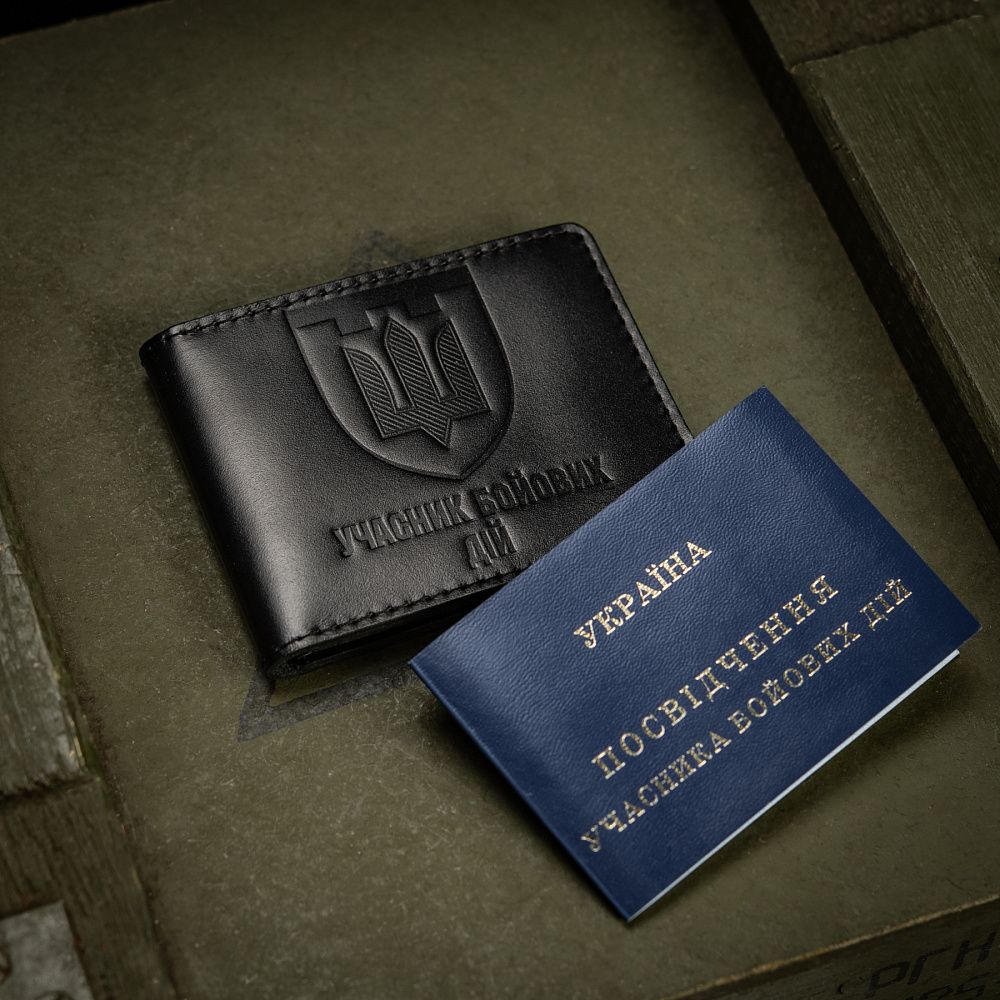 Виготовлена з високоякісної шкіри, що володіє винятковою стійкістю до стирання, міцністю та довговічністю. Спереду обкладинки розміщений горизонтальний напис «Учасник бойових дій», зверху якого розташований тиснений логотип Територіальної оборони України. Всередині передбачені прозорі відсіки для зручного розміщення вашого посвідчення.