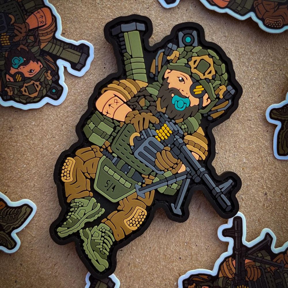 Нашивка від бренду SanCHI створена у колаборації з Assault Group. Патч з немовлям у бойовому спорядженні — це іронічна відповідь на заяви деяких громадян про те, що вони “не народжені для війни”.