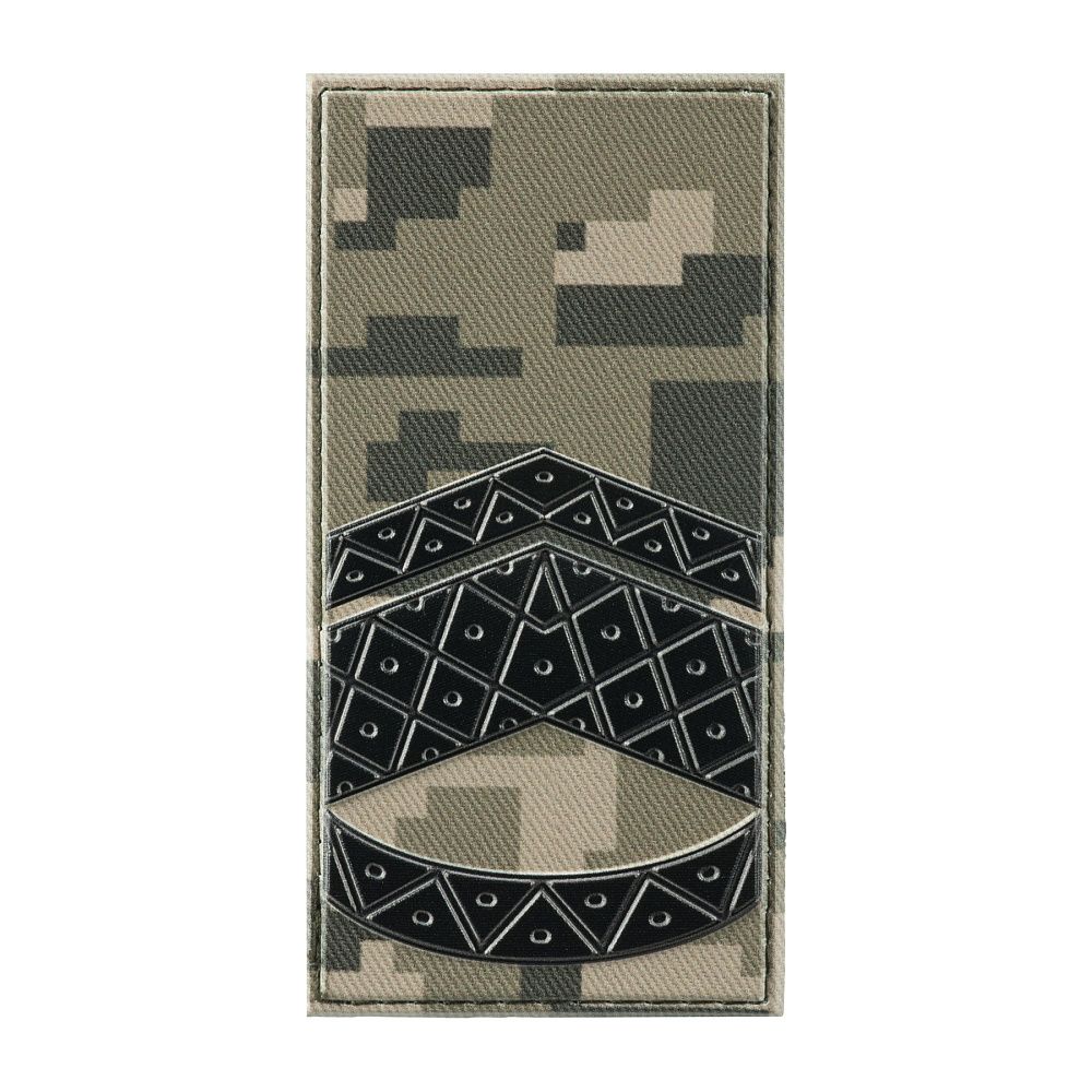 На погоні нанесені знаки, що позначають звання, фон- ММ14. Виконаний з високоякісного ПВХ матеріалу (полівінілхлориду) за технологією 3D, завдяки якій погон здається об'ємним, а зображення реалістичним. Завдяки цьому матеріалу, знаки розрізнення з часом не зіпсуються та не зітруться.