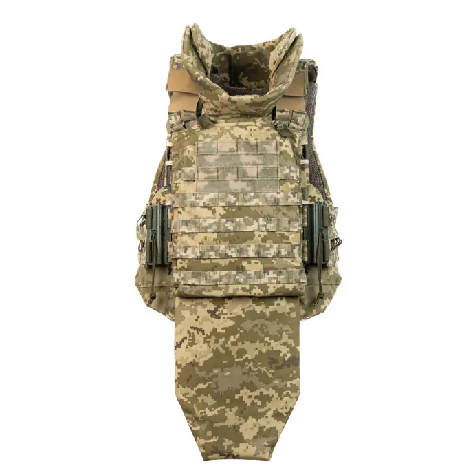 Комір та фартух. Мають зручну систему кріплення/роз’єднання. Комір є цільнокроєним, не має швів у місці згинання та кріпиться за допомогою липучки з напуском на м’яку броню жилета. Фартух регулюється за висотою та в разі потреби ховається під бронеплиту.