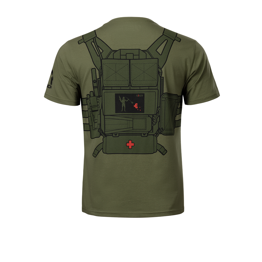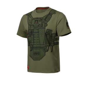 Футболка виконана в тактичному стилі з ефектним 3D-принтом передньої частини бронежилета з повним спорядженням