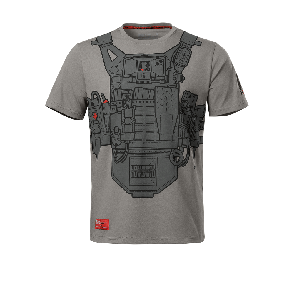 Футболка виконана в тактичному стилі з ефектним 3D-принтом передньої частини бронежилета з повним спорядженням