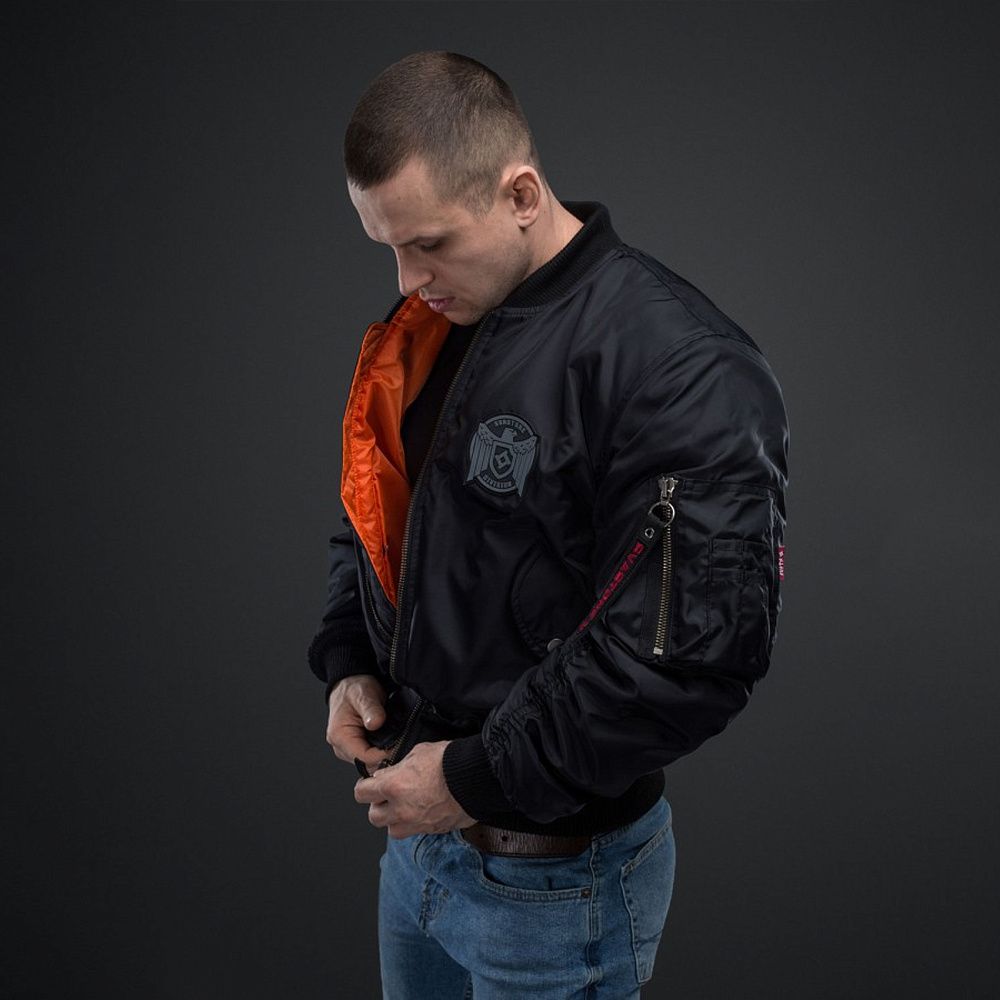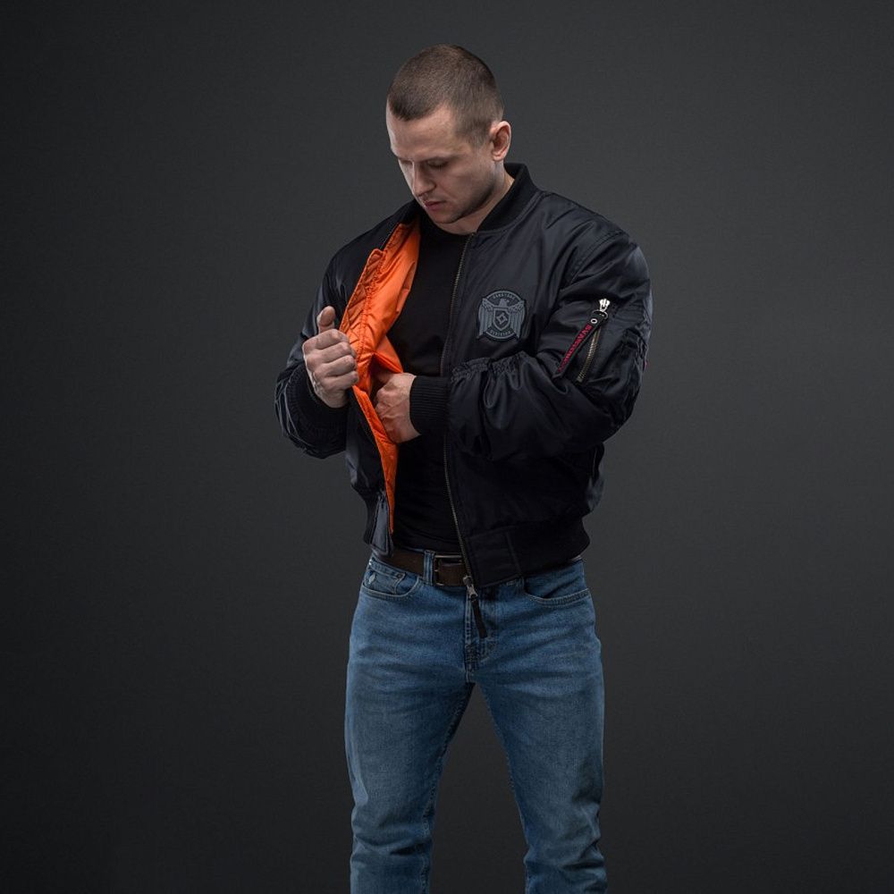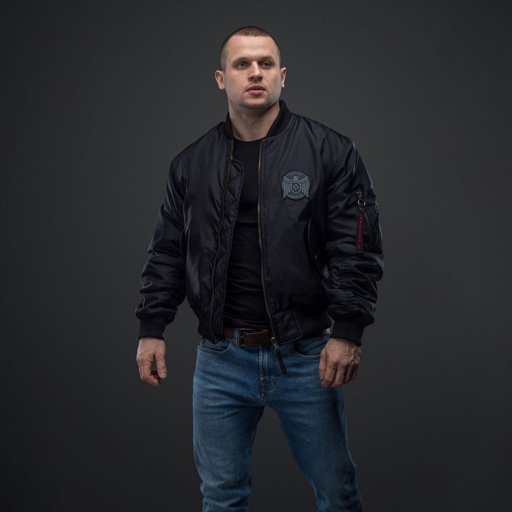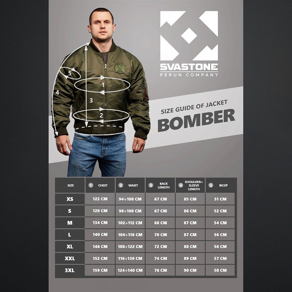 Також (як і в армійському прототипі) зверху на нарукавній кишені нашито 4 відсіки для ручок або олівців (по два у ряд). Збоку від них вшито червоний брендовий шилдик. Дві бічні врізні кишені на кнопці передбачено на внутрішній стороні бомбера. У районі серця розміщено солідний ПВХ-шеврон із суворим орлом і логотипом бренду на геральдичному щиті. У коло шеврону вписано напис «SVASTONE DIVISION».