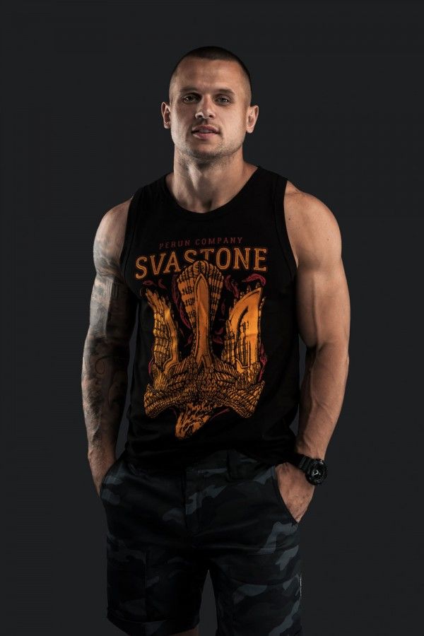 Майка Тризуб от уже довольно известной компании SVASTONE. Майка декорирована стилизированым принтом. Майка имеет приталенную форму. Проймы и горловина обработаны трикотажной лентой. Снизу нашита нашивка с логотипом производителя.