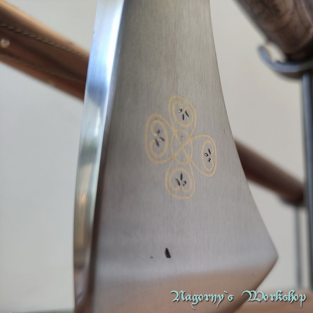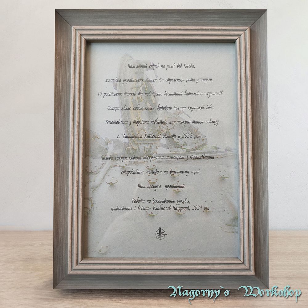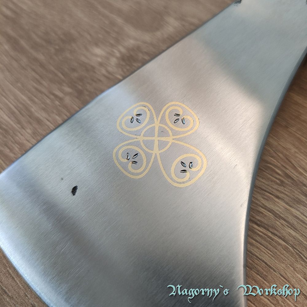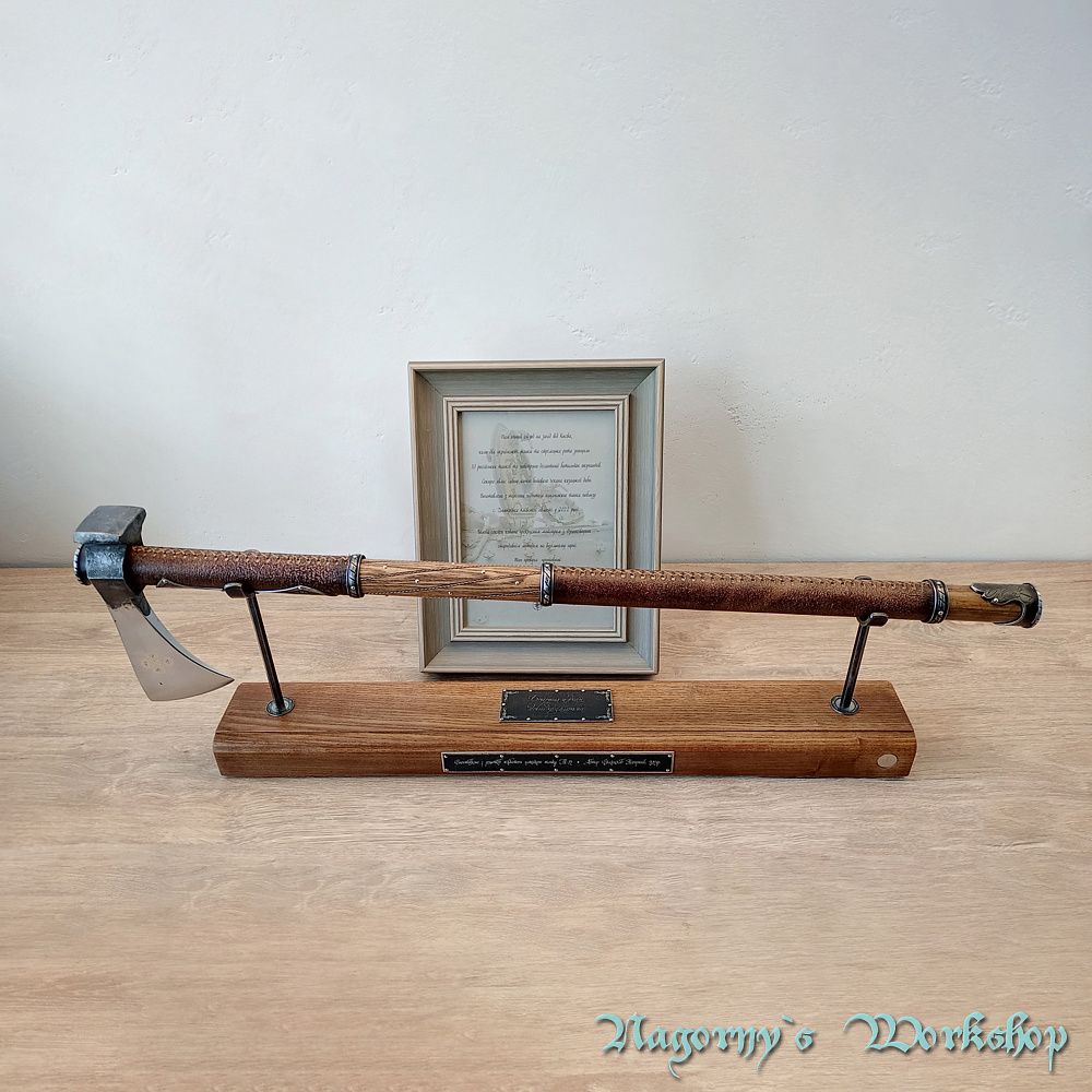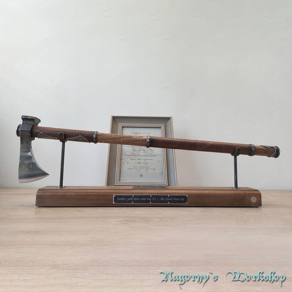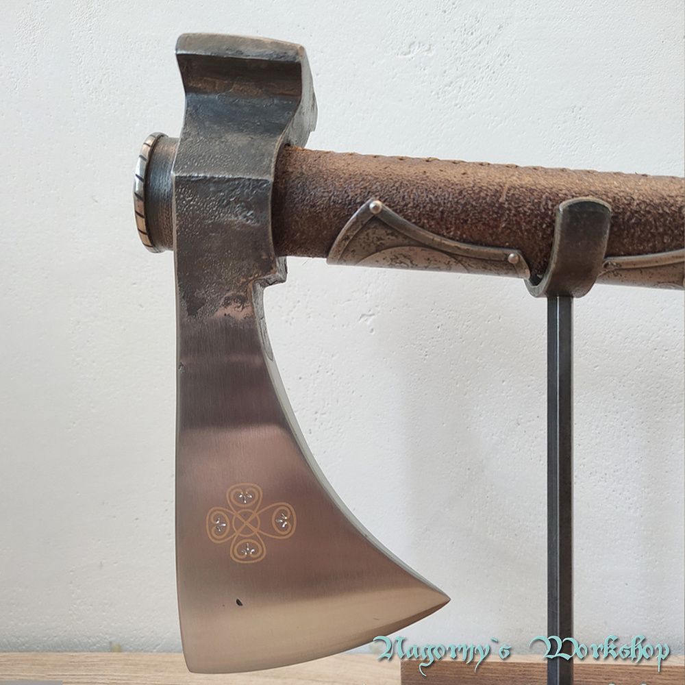 Голова сокири викована майстром з Франківська з прототипу справжнього артефакту, знайденого на теренах України. Композиційне рішення з подальшою оздобою, гравіюванням та всічкою - виконано майстром Владиславом Нагорним.