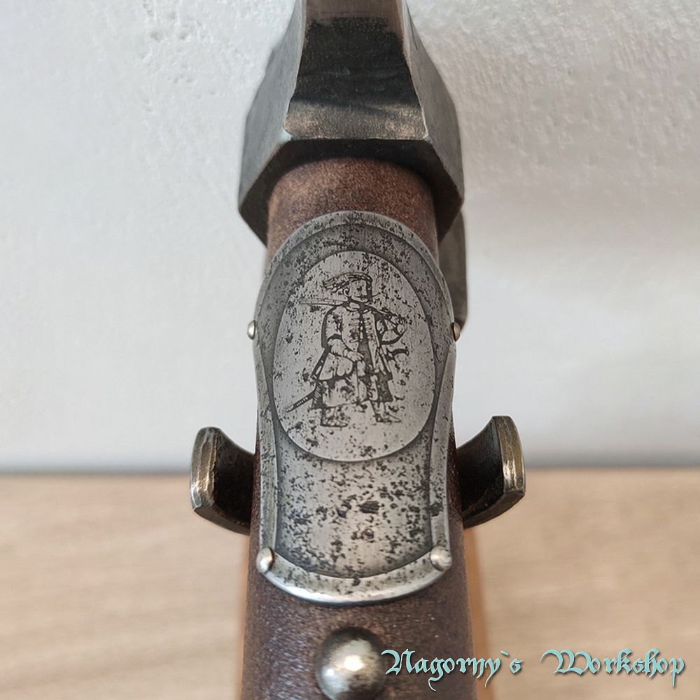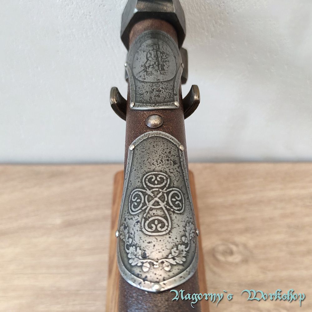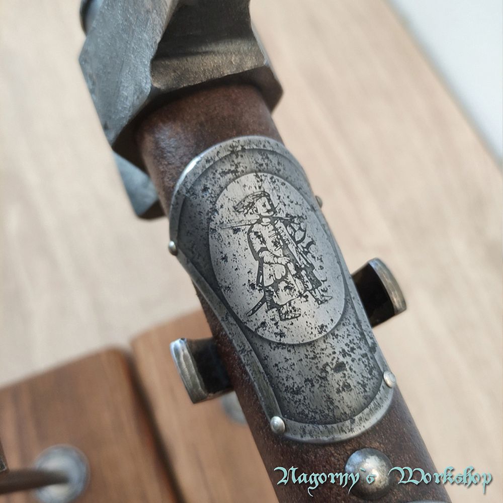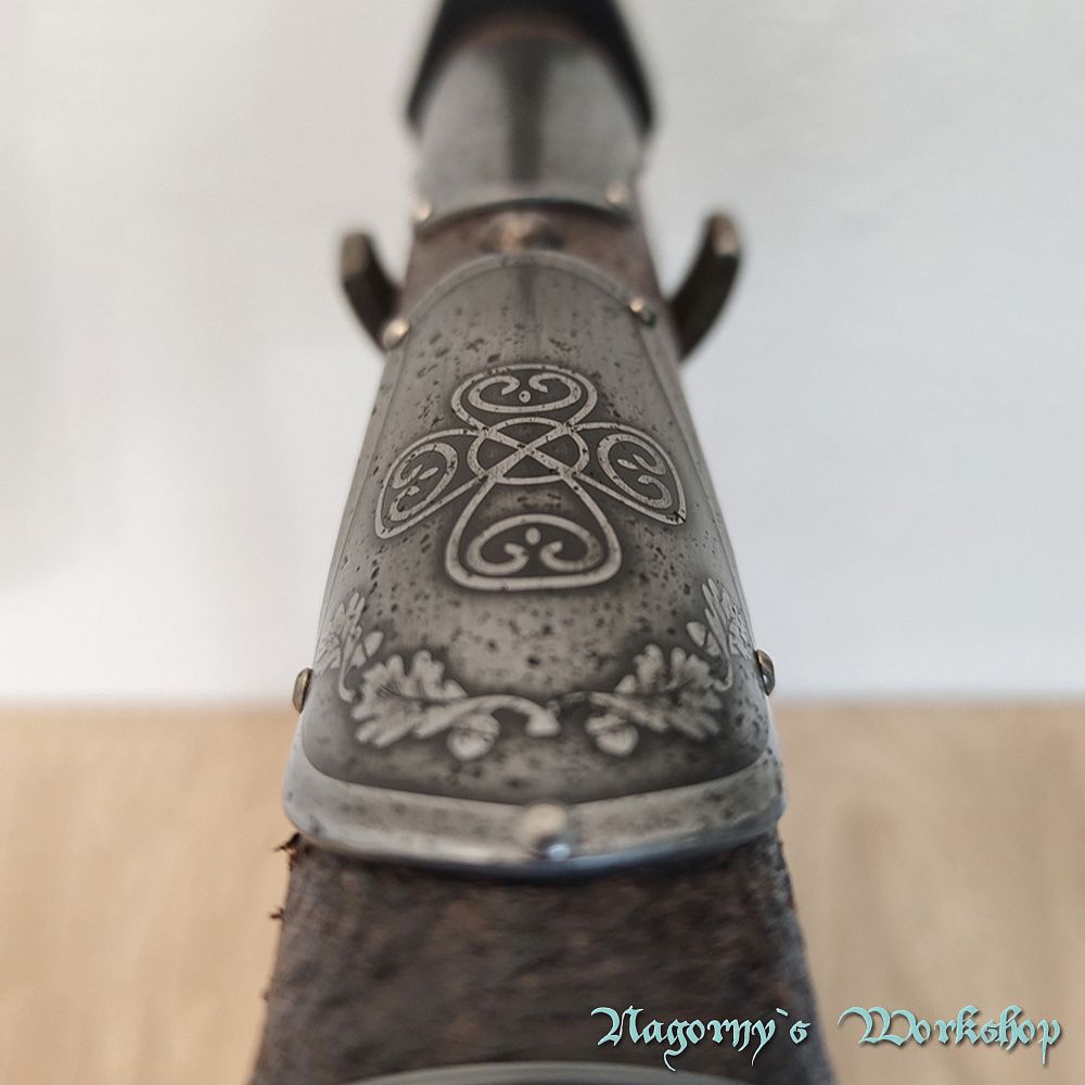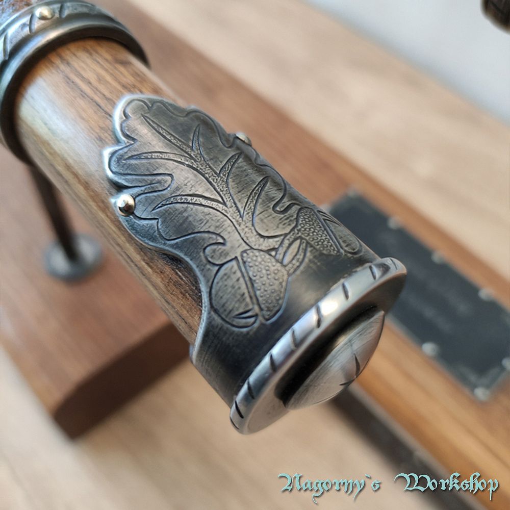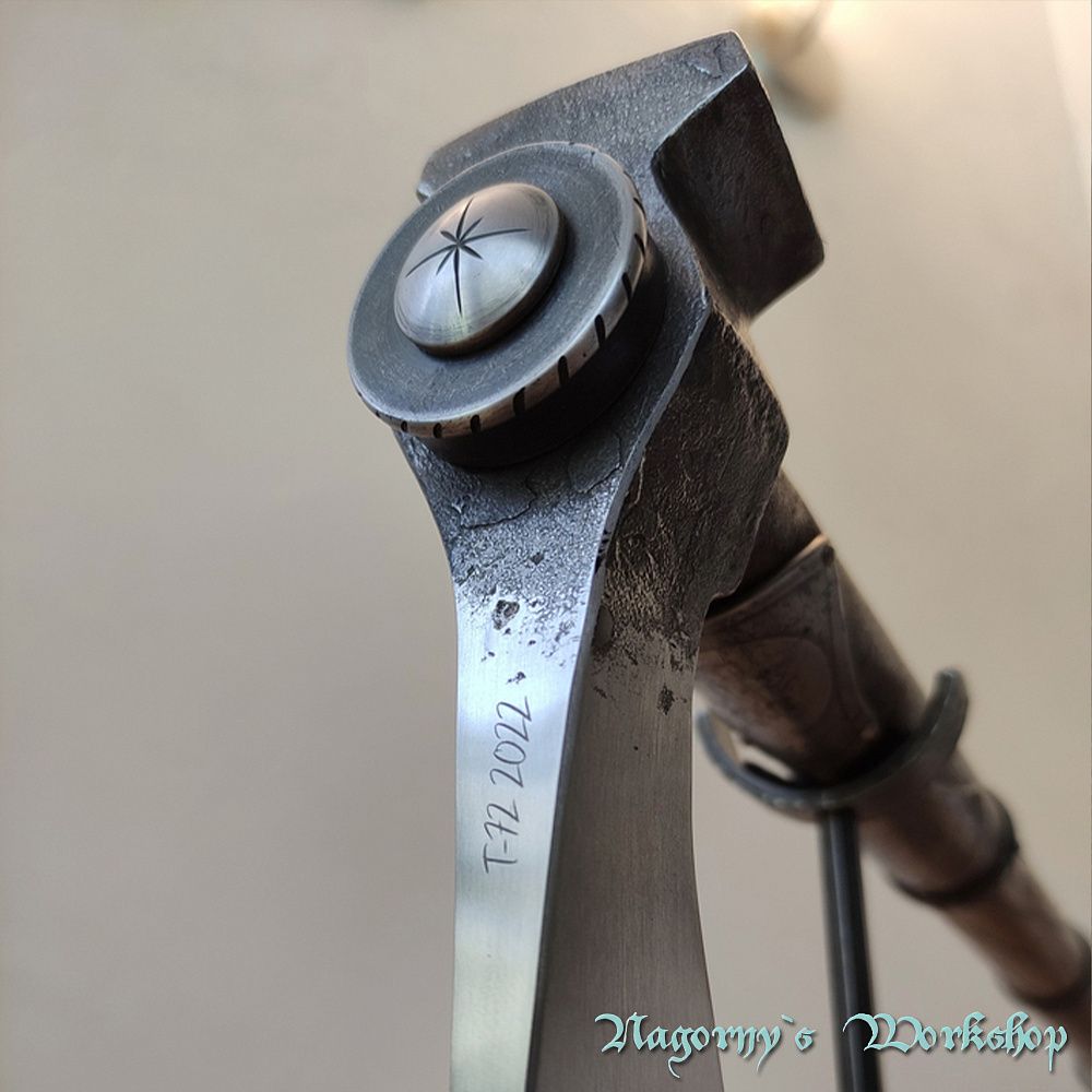 Голова сокири викована майстром з Франківська з прототипу справжнього артефакту, знайденого на теренах України. Композиційне рішення з подальшою оздобою, гравіюванням та всічкою - виконано майстром Владиславом Нагорним.