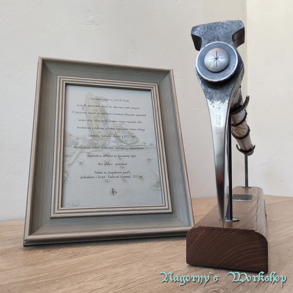 Вишукана копія бойового чекана доби козацтва від відомих українських майстрів, виготовлена зі сталі підбитого ворожого танку.