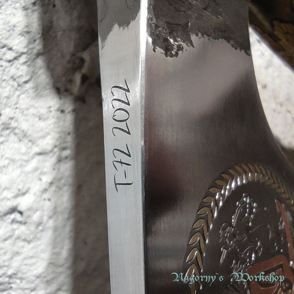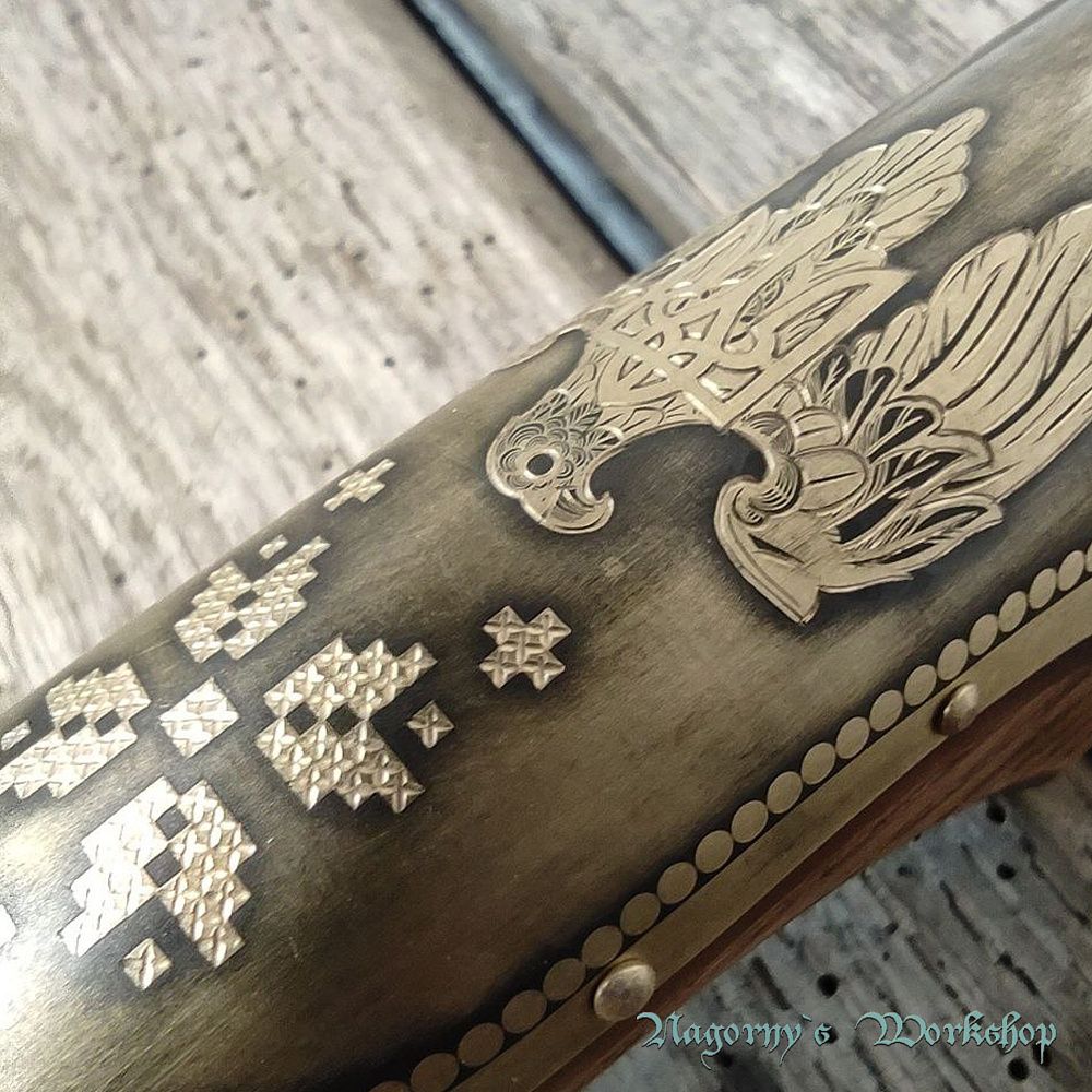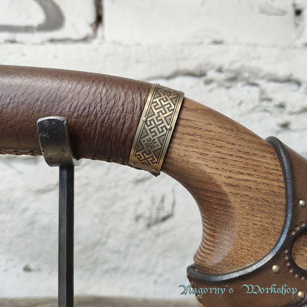 Тип провуха - прошивний. Матеріал - торсіонна сталь 60С2А. Руків'я, ложемент - ясен. Оздоба - латунь, мідь та натуральна шкіра. Ручне гравірування, висічка - латунь/мідь
