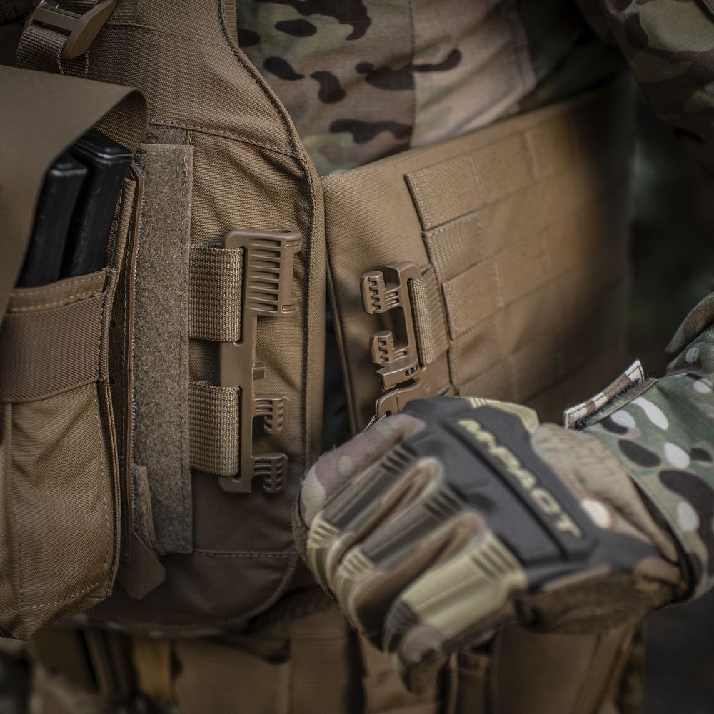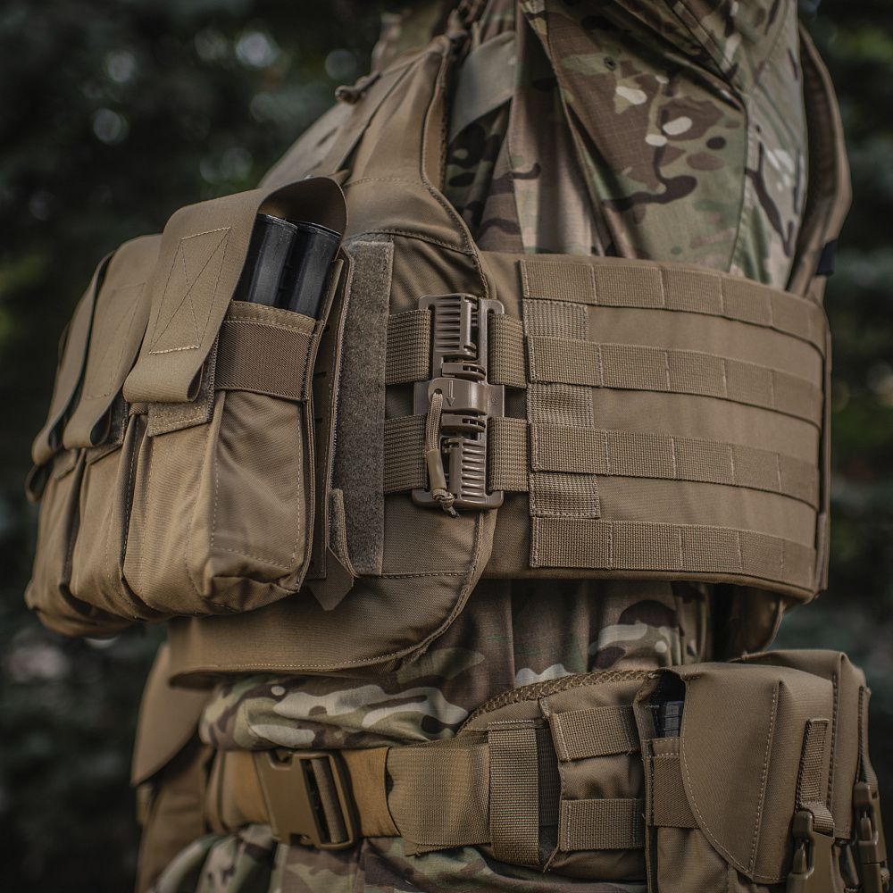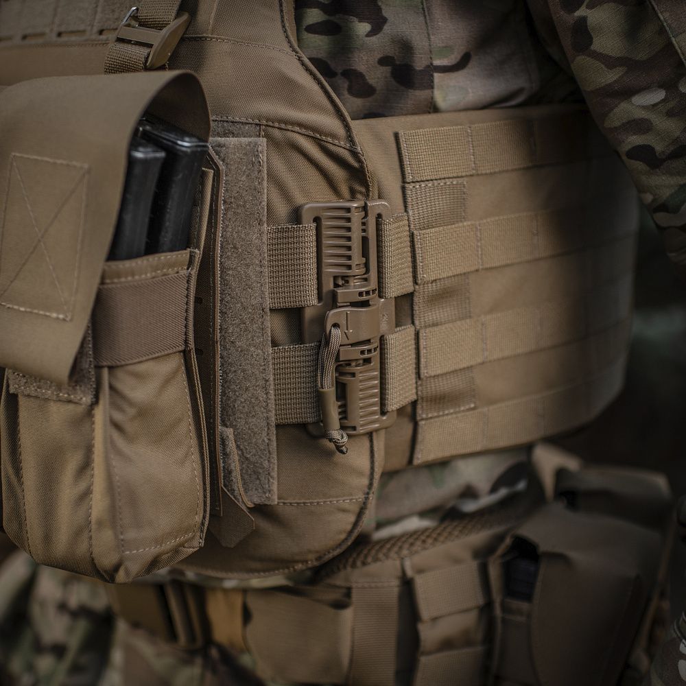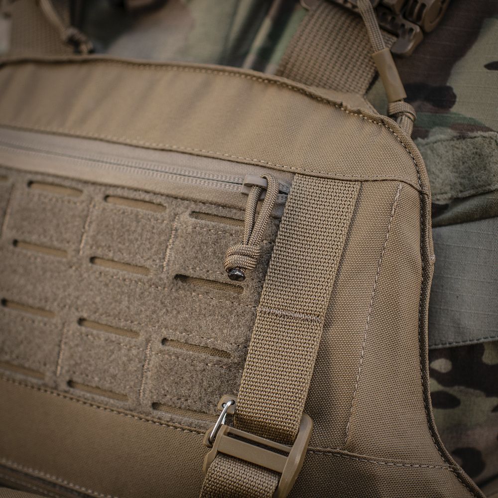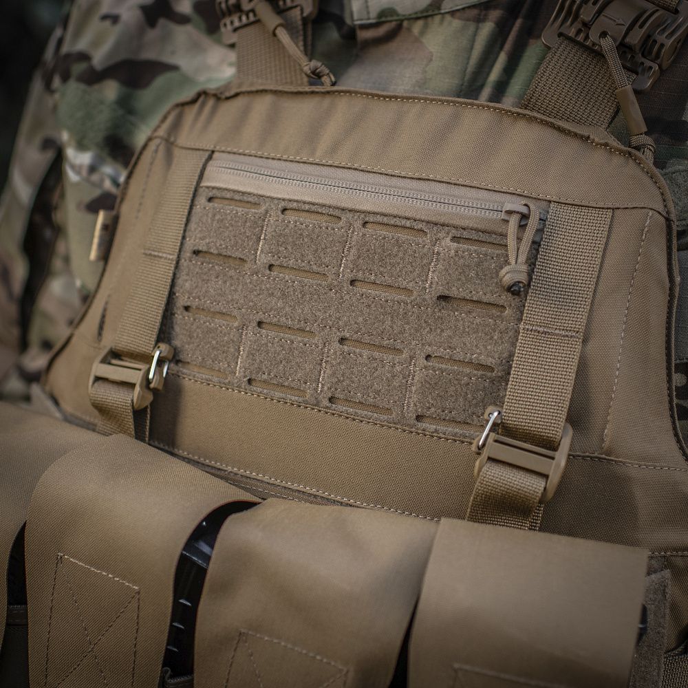 Впереди чехол бронежилета оснащен специальной Molle панелью, сделанной по технологии Laser Cut и позволяющей удобно разместить подсумки, кобуры, аптечки, органайзеры и другое снаряжение. Чтобы избежать случайного срыва с основы Velcro, она крепится к стропам на чехле с помощью карабинов Woojin.