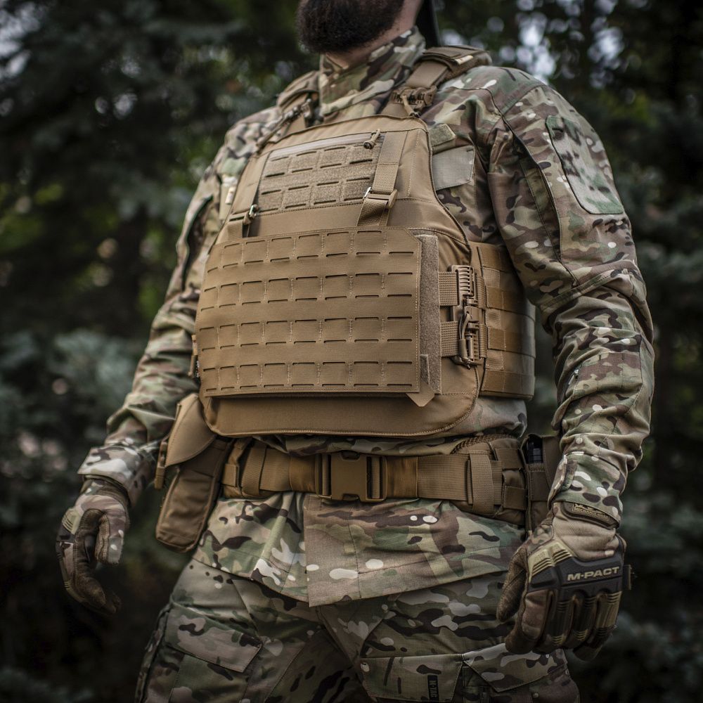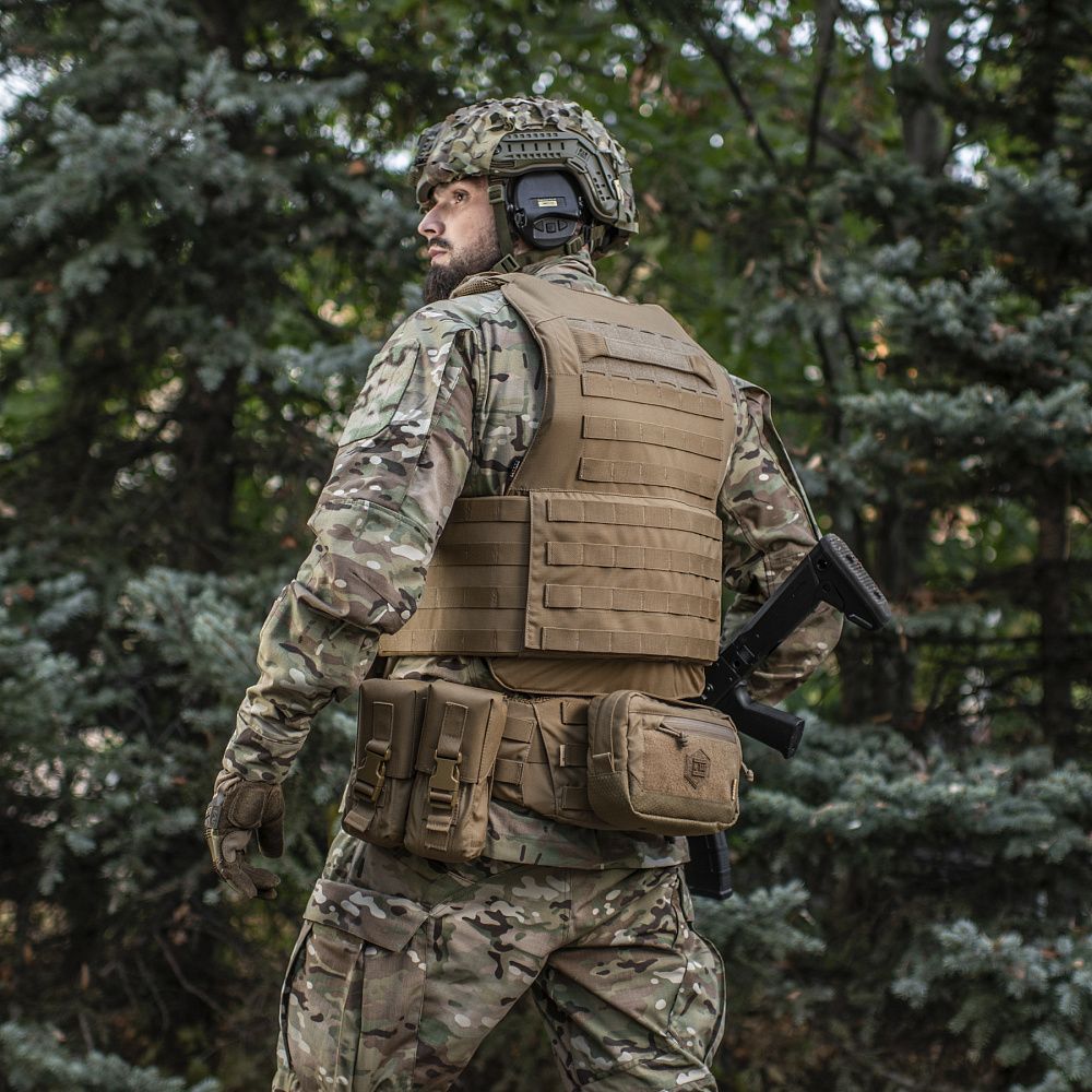 Чехол бронежилета изготовлен из высококачественного материала Cordura 500D – сверхпрочной ткани, устойчивой к истиранию и высоким нагрузкам. Расширенный камербанд с Molle интерфейсом на 4 стропы при необходимости позволяет разместить дополнительное снаряжение, например, горизонтальные аптечки или утилитарные подсумки.