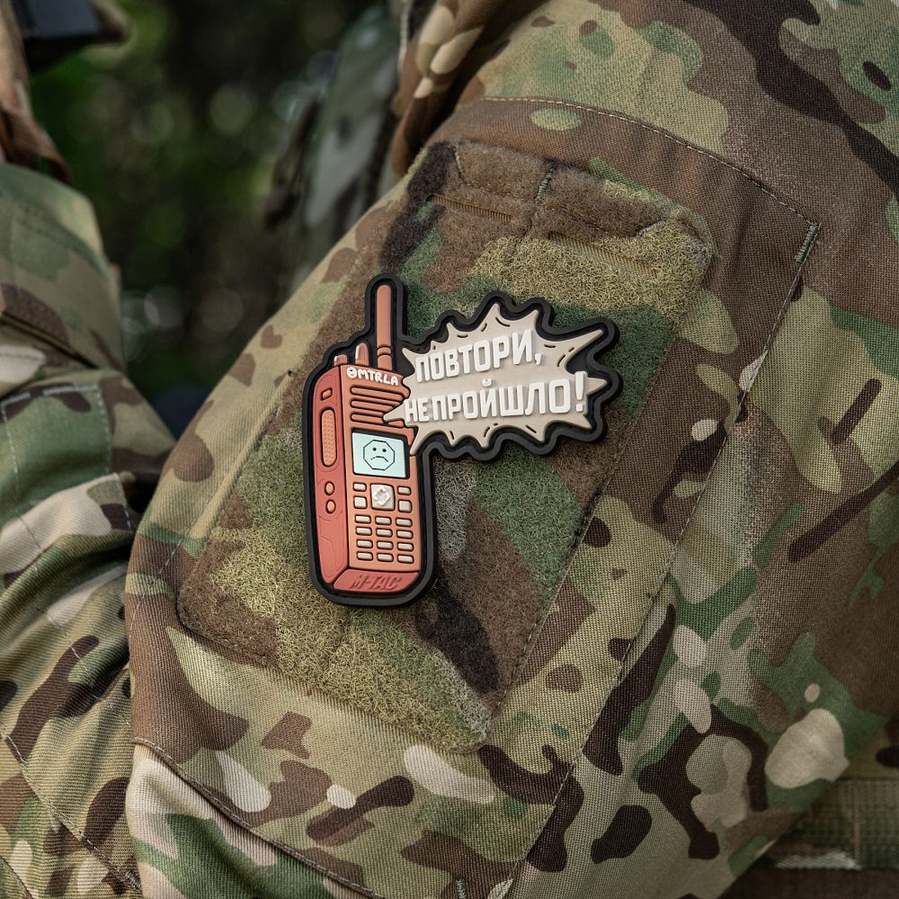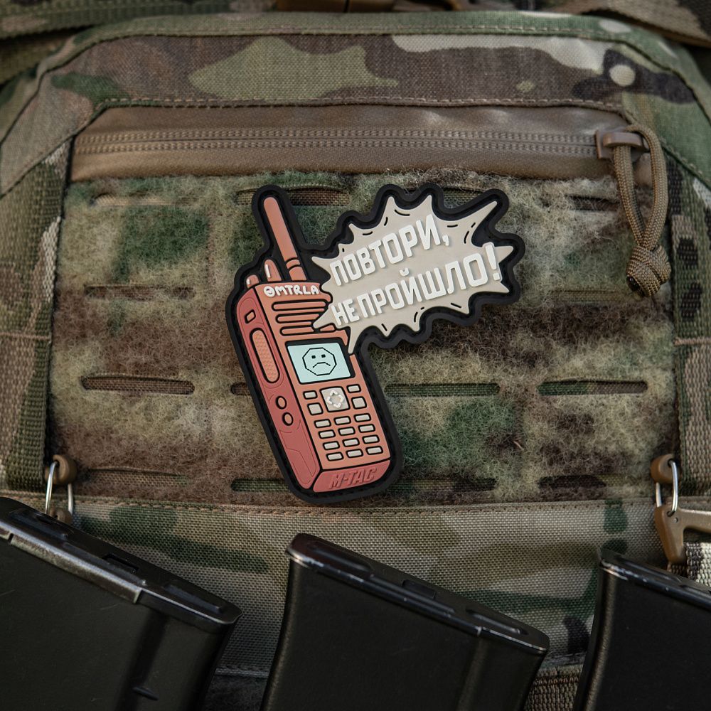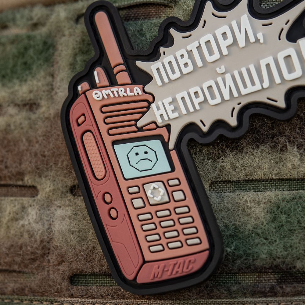 Дизайнеры бренда М-Тас создали новую моральную нашивку ПОВТОРИ - НЕ ПРОЙШЛО (PVC), которая саркастически иллюстрирует прогрессивность радиосвязи в зоне боевых действий.