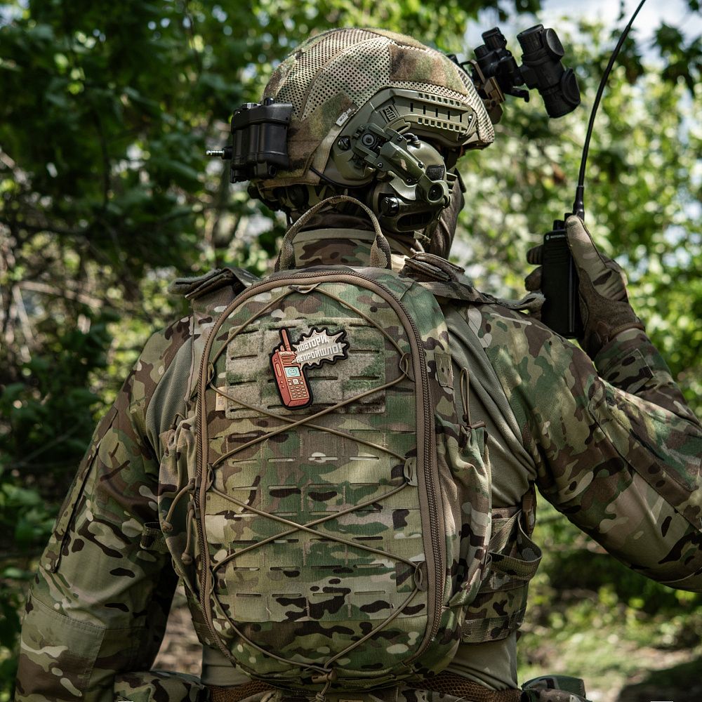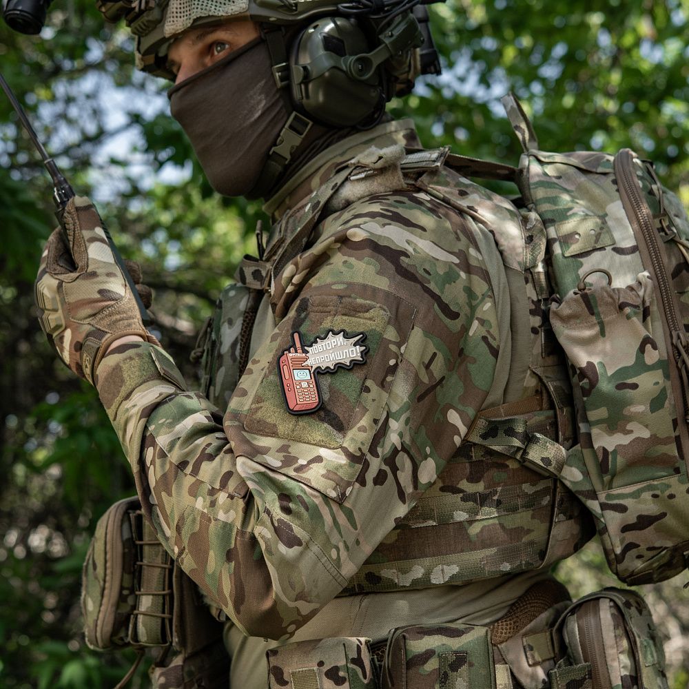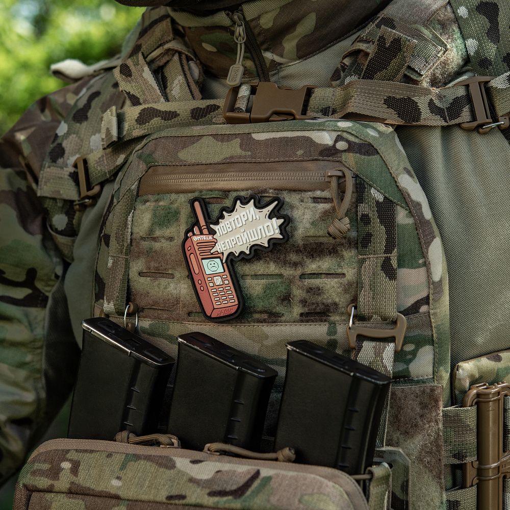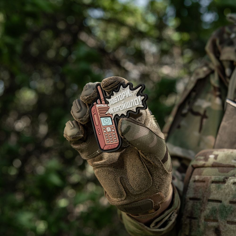 Дизайнеры бренда М-Тас создали новую моральную нашивку ПОВТОРИ - НЕ ПРОЙШЛО (PVC), которая саркастически иллюстрирует прогрессивность радиосвязи в зоне боевых действий.